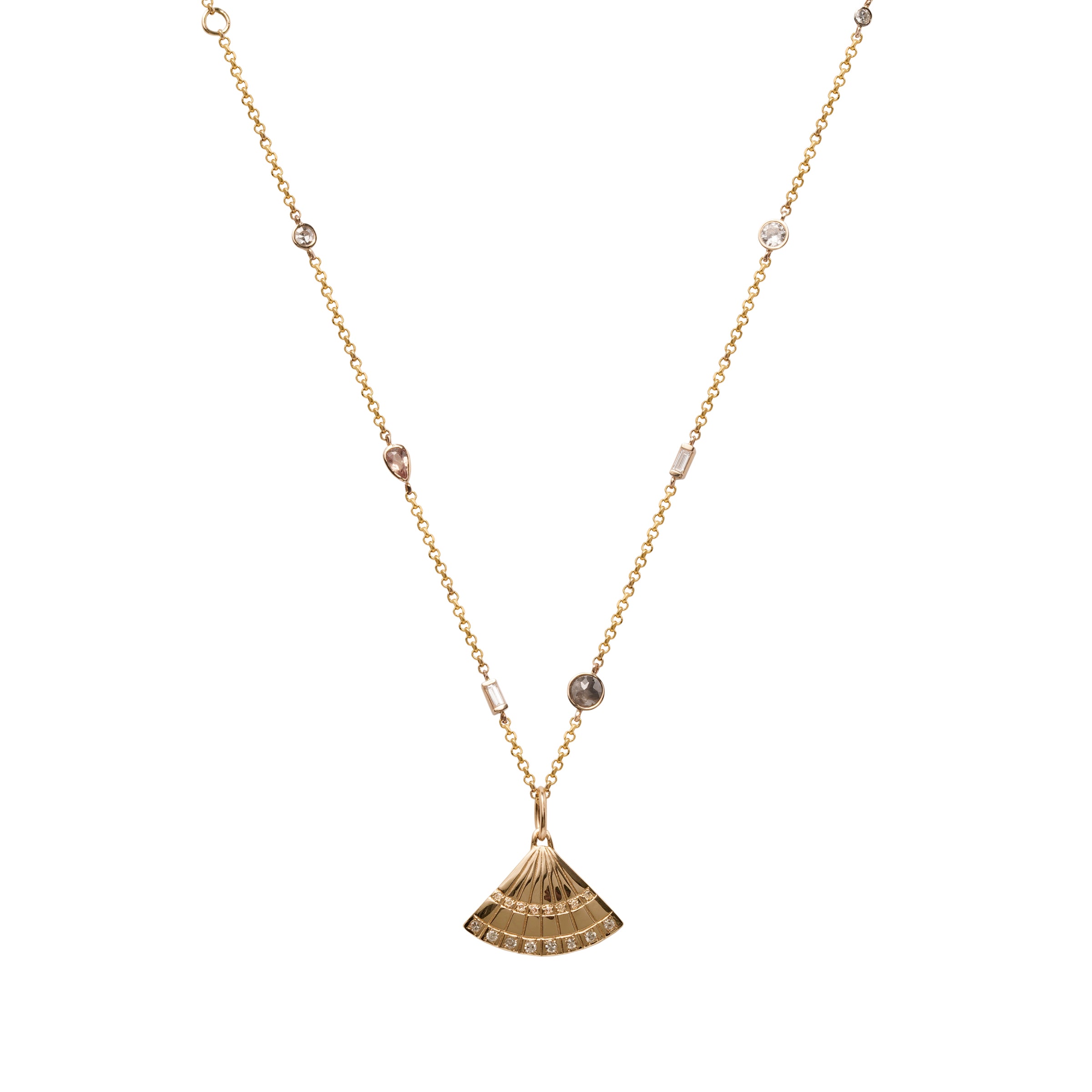 A beautiful large 14k gold fan hangs from a simple large bail that can attach to any chain or charm link. The fan measures approximately 1” in width . APPROX .18 carats of Light Grey diamonds are set on the middle row and along the bottom edge of the fan white diamonds sparkle.