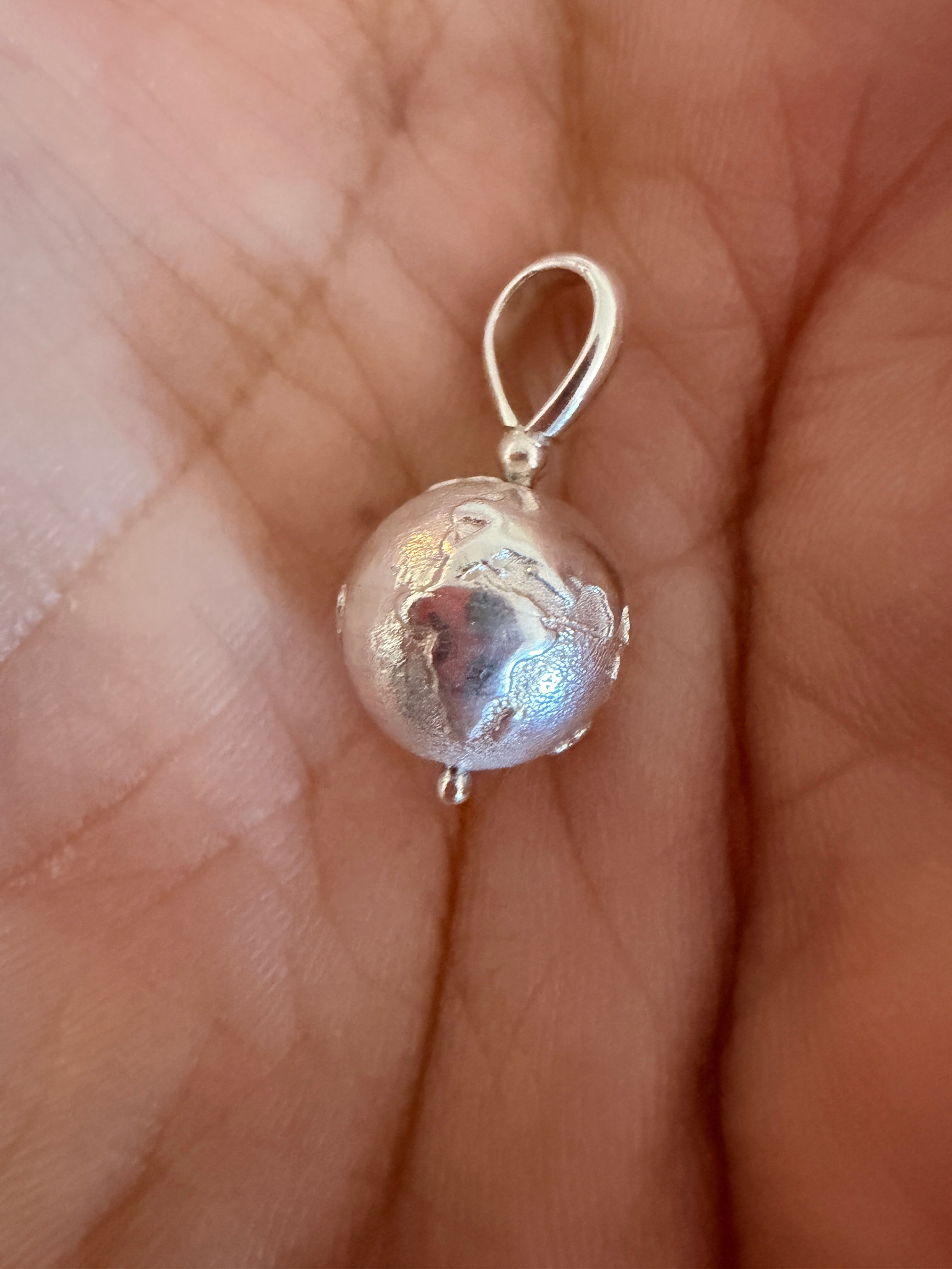 The Charm  is a silver hollow globe 10mm in circumference and hangs from a large bail. Can be worn alone or mixed with your favorite charms.  "Our Precious little world" is a reminder to value what we have been given.  This Charm is a miniature version of an antique Charm.